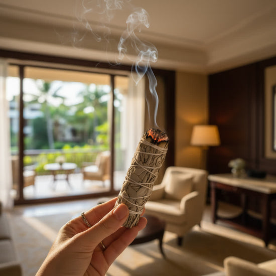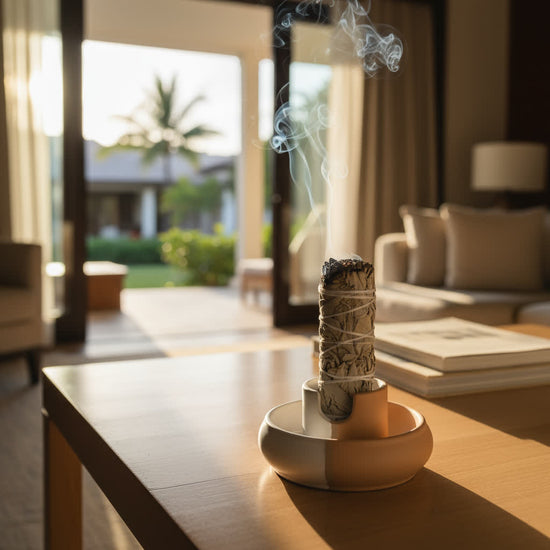 Light the tip of the bundle until it catches flame, then gently blow it out to allow the sage to smolder. Let the smoke fill your space, move it around with your hand or a feather, and place it in a fire-safe dish. Always use in a well-ventilated area. Do not leave burning sage unattended.